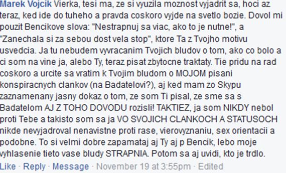 A p. Benčík tam mal dôležitú prednášku “Prečo je extrémizmus nebezpečný”. Ale nie ten jeho neoliberálny extrémizmus. Ten si on stráži. Deň na to Vierka na FB napísala (v čase písania tohto článku tento status stiahla (!) aj spolu s fotkami, no možno ho tam naspäť dá), že stretnutie voňalo človečinou, bolo plné inšpiratívnych ľudí a že svet robia lepším. Hmm! A potom mu, tiež asi s vidinou lepšieho sveta, dodala inšpiráciu, keď sa mu vyžalovala, ako na ňu jej najlepší priatelia zanevreli. Pravda je taká, že ona sama zanevrela na nás, po tom, ako tak obzvlášť agresívnym spôsobom kritizovala (na to mám záznam, ktorý nateraz nezverejním, lebo je obsiahly) môj slobodný a demokratický názor – že čiste z perspektívy sociálnej vedy a výskumu nesúhlasím s LGBTI adopciami.